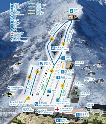 ⑤⑥全段5段不同落差設(shè)計(jì),為初級滑雪者逐步升級帶來更多的落差選擇,滿足中級滑雪者對雪道變化的需求。全道最后一段為2號雪道390米,是2011年先開放的初級雪道。5號雪道長450米,2號雪道長390米,兩條雪道平均寬度30米,平均坡比為26.9%,2號雪道及5號雪道全程配有纜車,其中