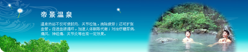 帝景溫泉度假村所在地第三紀(jì)地?zé)釡厝獌?chǔ)藏80億立方,水溫高達(dá)96℃,水質(zhì)清澈透明,富含鋰,鍶,鋅,偏硅酸等多種保健礦物質(zhì)。從醫(yī)學(xué)角度上講,鋰可起到鎮(zhèn)定安神作用并對(duì)心血管疾病有預(yù)防治療功效;鍶有強(qiáng)化骨骼的作用可預(yù)防骨質(zhì)疏松此類疾病并對(duì)心血管類病有一定的治療保健功效;鋅是人體的補(bǔ)充劑對(duì)美容護(hù)膚及增強(qiáng)人體新陳代謝功能具有良好的功效;偏硅酸可起到強(qiáng)壯骨骼鎮(zhèn)靜安神作用,對(duì)肥胖癥/風(fēng)濕疼痛/蕁麻疹/心血管/慢性消化道疾病等都有一定療效。豐富的礦物質(zhì)含量,溫和的水質(zhì)和充沛的儲(chǔ)量,實(shí)屬國(guó)內(nèi)罕見的保健溫泉水。